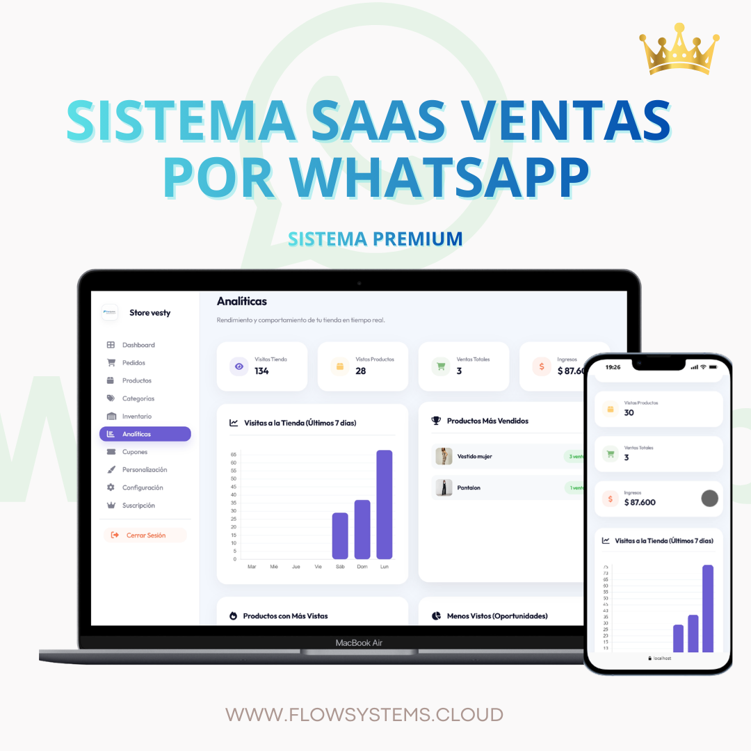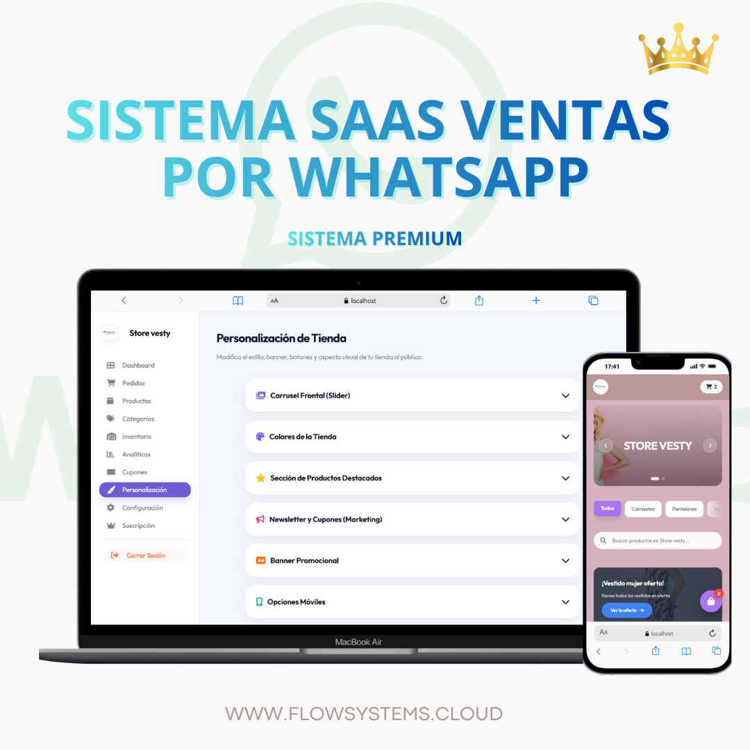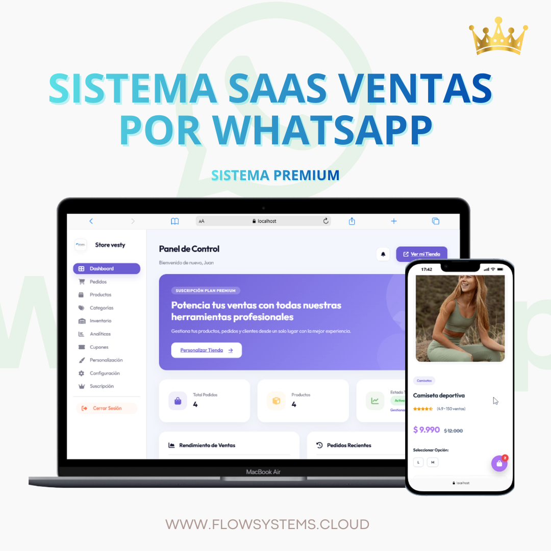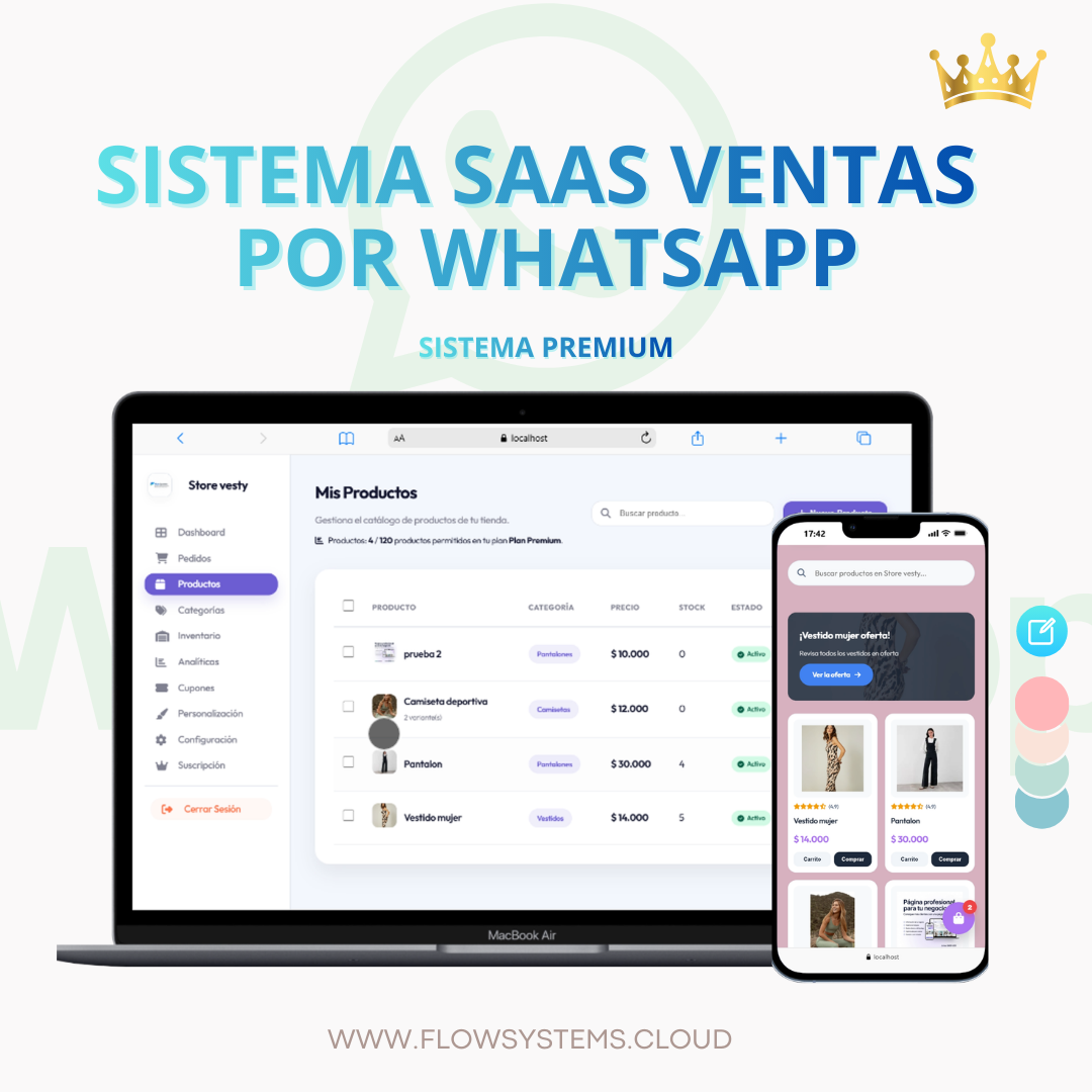 Incluye panel administrador, sistema de suscripciones, gestión de productos, inventario, analíticas, marketing, cada tienda recibe pedidos por WhatsApp y en su panel y herramientas avanzadas de personalización.